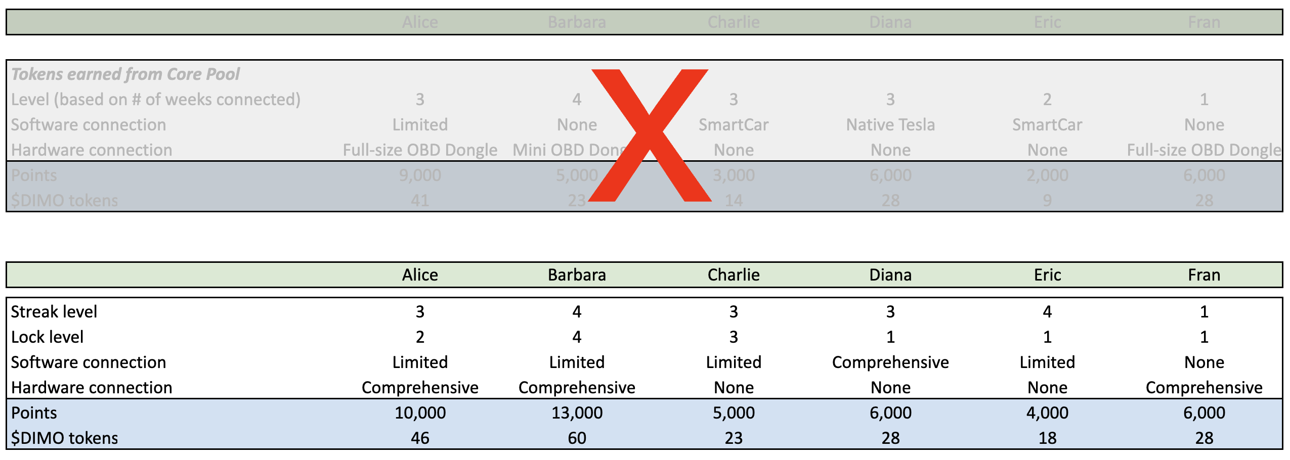 In the example shown in the table above, Alice earns 2,000 points for having been connected between 21 to 35 weeks, <mark style="color:red;">1,000 points for locking 500 $DIMO for 6 months,</mark> 1,000 points for her Limited software connection, and 6,000 points for having comprehensive device installed in her vehicle.