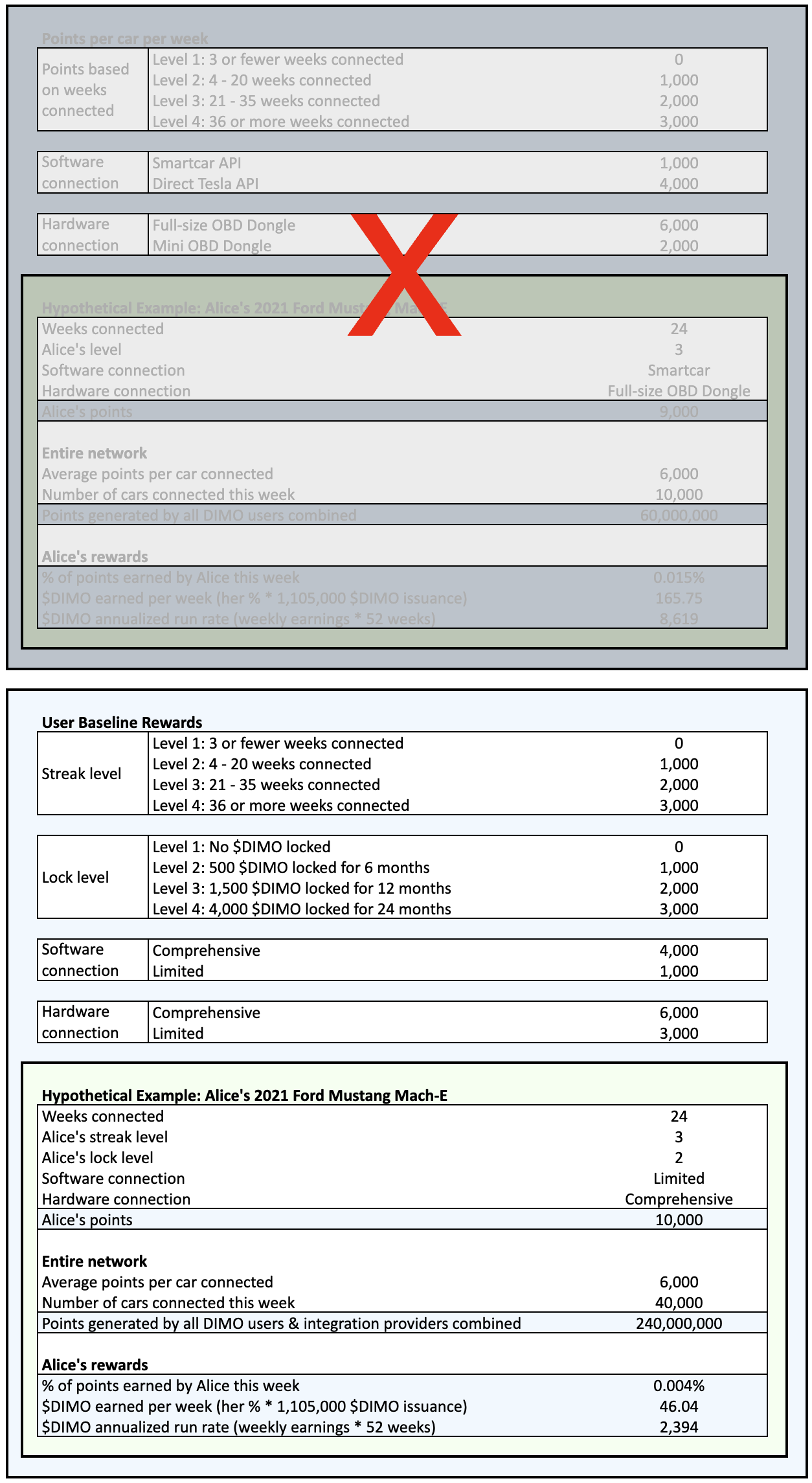 In the example shown in the table above, Alice earns 2,000 points for having been connected between 21 to 35 weeks, 1,000 points for locking 500 $DIMO for 6 months, 1,000 points for her Limited software connection, and 6,000 points for having comprehensive device installed in her vehicle.