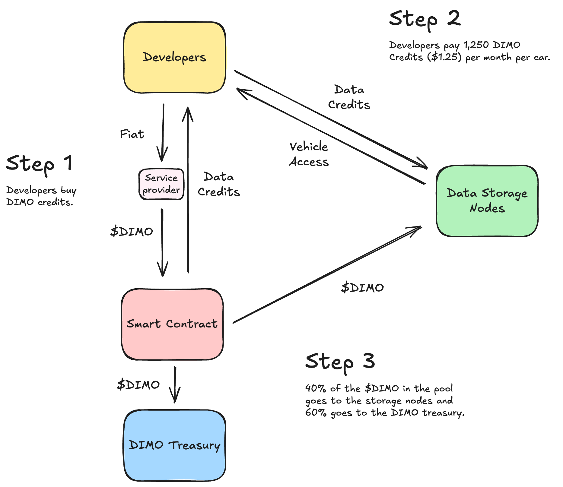 Developers accessing vehicle data pay a simple fee per vehicle per month. Proceeds are partially distributed to the nodes that store the offchain vehicle data and partially kept by the DIMO protocol treasury as profit. This treasury can be reinvested or burned per future governance votes.